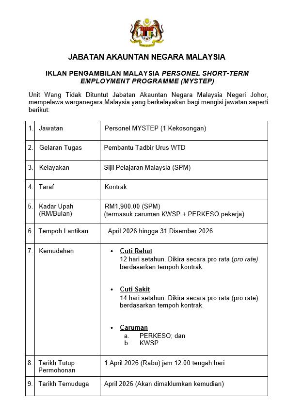 | Tarikh Tutup | 1 April 2026 (12.00 tengah hari) |