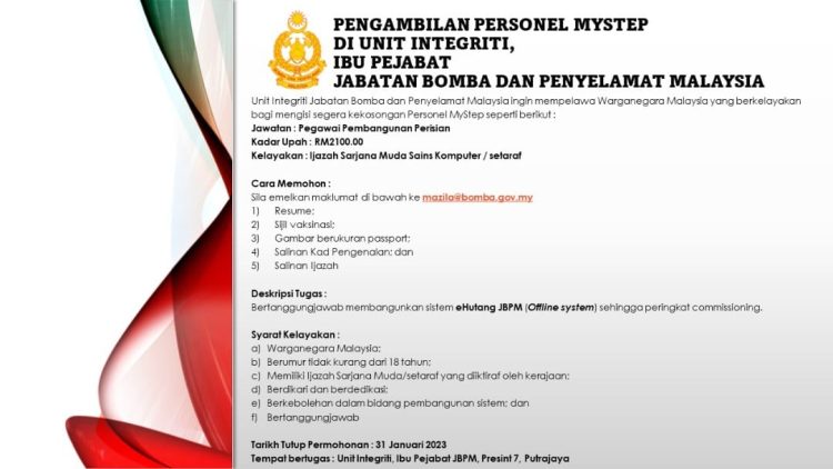 Anda graduan yang sedang mencari kerja dan peluang untuk bina kerjaya? Jom bina kerjaya dengan peluang penempatan MySTEP yang dibuka oleh Jabatan Bomba dan Penyelamat Malaysia tahun 2023 ini! Calon yang layak mendapat penempatan akan berkhidmat secara kontrak pada tahun 2023.