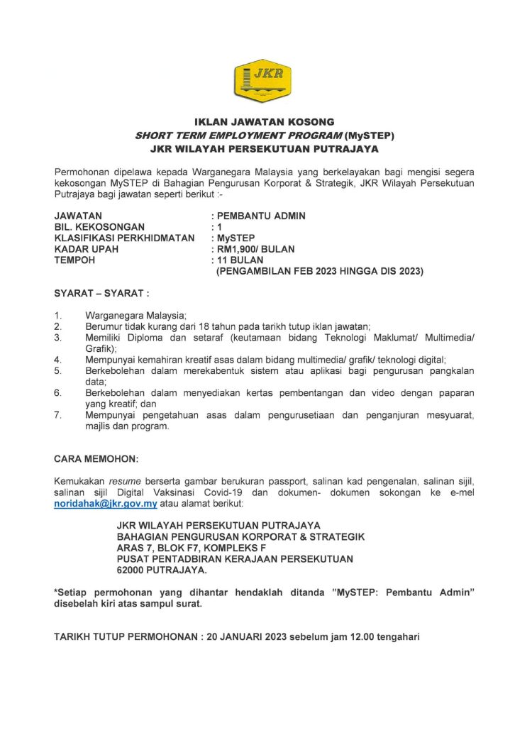 Jabatan Kerja Raya (JKR) Gombak kini membuka tawaran kerja sebagai Personal MySTEP bagi pengambilan 2023. Permohonan dipelawa kepada Warganegara Malaysia yang berkelayakan bagi mengisi segera kekosongan MySTEP di JKR Wilayah Persekutuan Putrajaya seperti yang diiklankan.