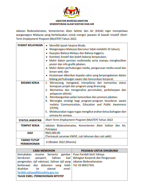 Kementerian Alam Sekitar Dan Air (KASA) ingin mempelawa Warganegara Malaysia yang berkelayakan bagi mengisi kekosongan Personal Short Term Employment Program (MySTEP) di Jabatan Biokeselamatan, Kementerian Alam Sekitar dan Air Putrajaya seperti yang diiklankan.