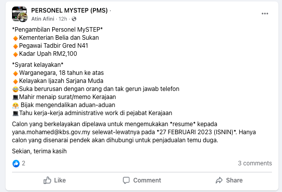 Ikuti perkongsian di bawah untuk maklumat lanjut jawatan ditawarkan dan panduan buat permohonan.