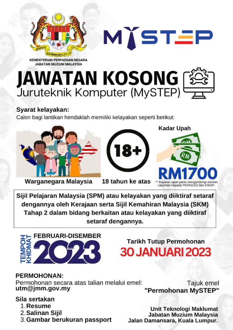 MySTEP 2023 merupakan salah satu inisiatif kerajaan yang dilaksanakan untuk membantu meningkatkan peluang pekerjaan dan pendapatan rakyat Malaysia. Kementerian Perpaduan Negara (KPN) kini menawarkan peluang jawatan MySTEP kepada individu yang berkelayakan.