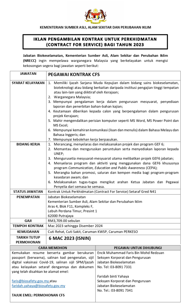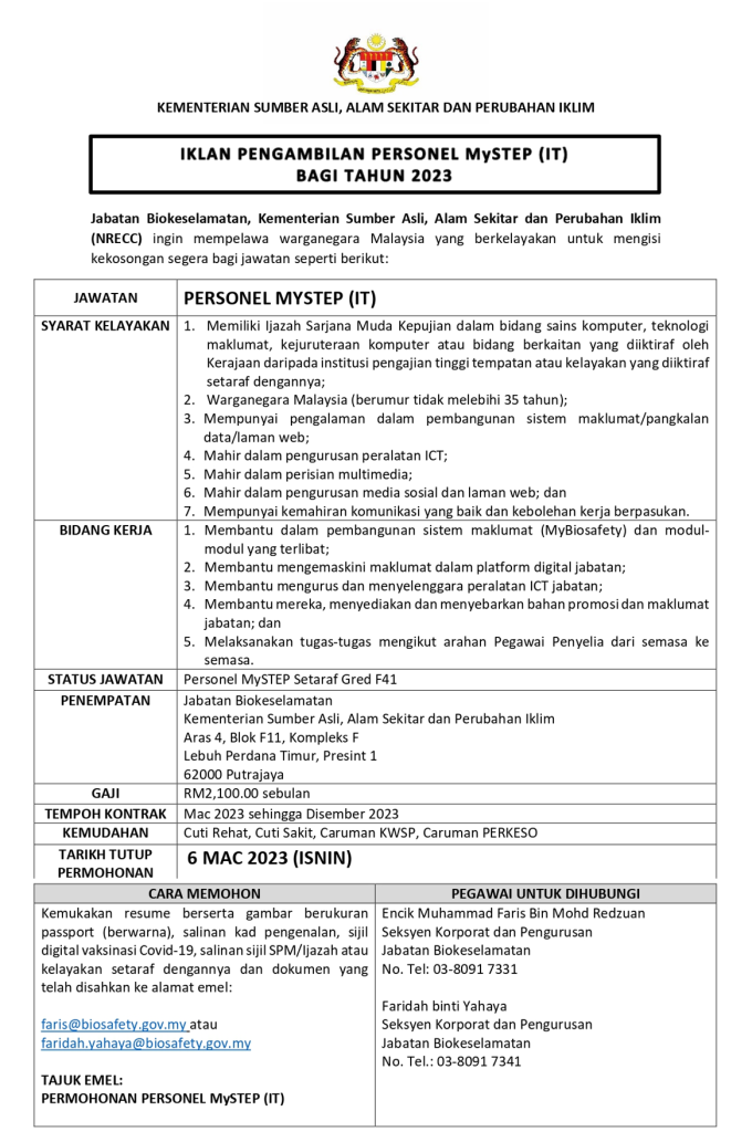 Kementerian Sumber Asli, Alam Sekitar dan Perubahan Iklim ingin mempelawa Warganegara Malaysia yang berkelayakan bagi mengisi kekosongan Personal Short Term Employment Program (MySTEP) di Jabatan Biokeselamatan, Kementerian Sumber Asli, Alam Sekitar dan Perubahan Iklim seperti yang diiklankan.