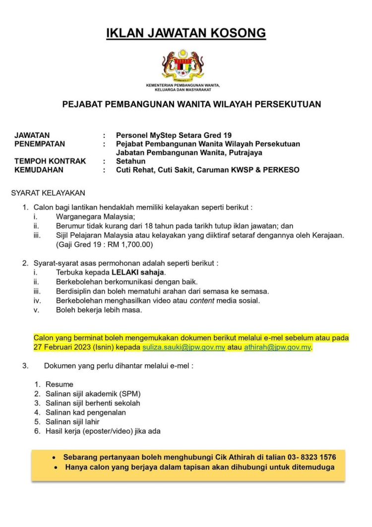 Ikuti perkongsian di bawah untuk maklumat lanjut jawatan MySTEP KPWKM yang ditawarkan dan cara buat permohonan.