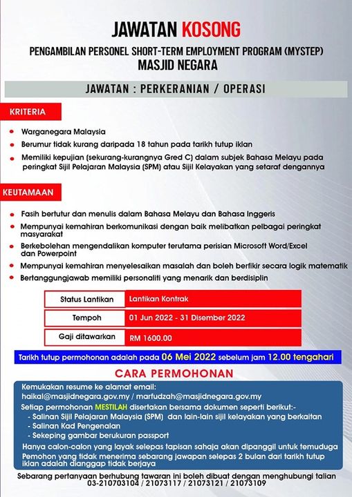 Jika anda berminat untuk berkhidmat dengan Masjid Negara dan memenuhi syarat kelayakan yang dinyatakan, pastikan anda hantar permohonan melalui email sebelum tarikh tutup permohonan. Calon yang berjaya akan ditugaskan di bahagian perkeranian/ operasi.