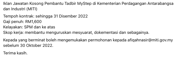 Ikuti perkongsian di bawah untuk maklumat lanjut jawatan ditawarkan dan panduan buat permohonan.