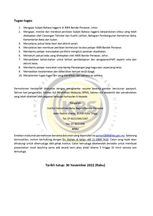 - Mengajar Subjek Bahasa Inggeris IKBN Bandar Penawar, Johor