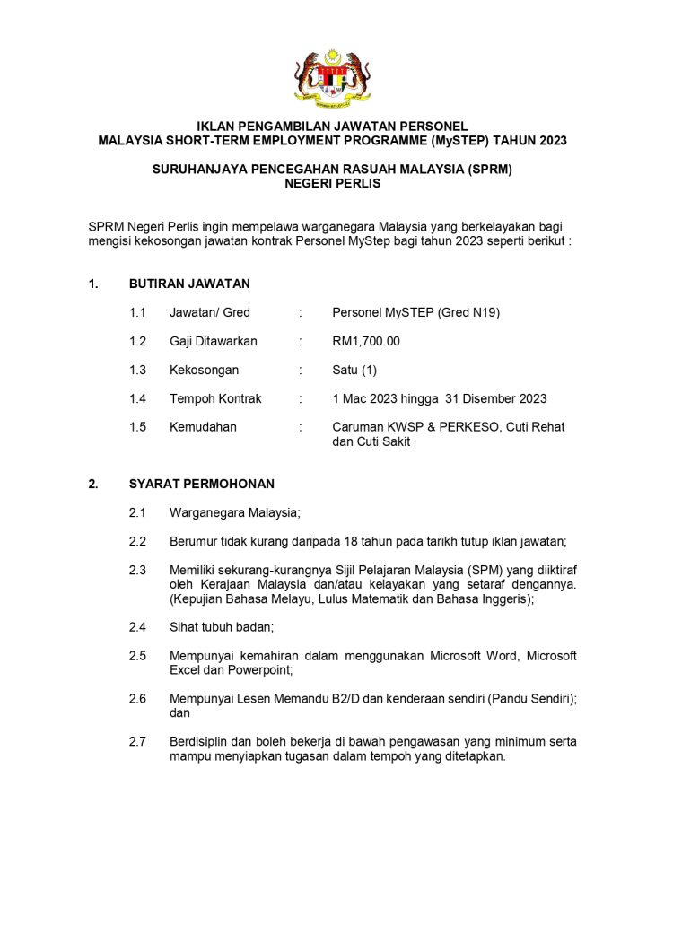 Bahagian Pengurusan Rekod dan Maklumat, Suruhananjaya Pencegahan Rasuah Malaysia (SPRM) ingin mempelawa Warganegara Malaysia yang berkelayakan bagi mengisi segera kekosongan Personel MySTEP bagi jawatan seperti yang diiklankan.