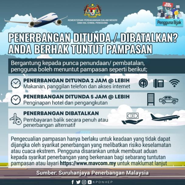 Ikuti perkongsian di bawah untuk maklumat lanjut jenis pampasan yang boleh dituntut jika terkesan dengan dengan masalah perkhidmatan penerbangan dan cara buat tuntutan pampasan.