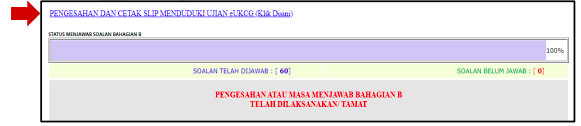 - Setelah calon selesai menjawab Bahagian A dan Bahagian B, calon perlu klik “PENGESAHAN DAN CETAK SLIP MENDUDUKI UJIAN e-UKCG” pada pautan yang disediakan.