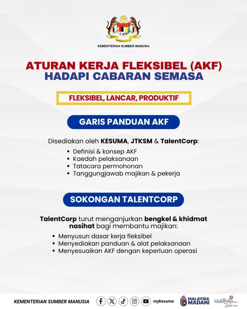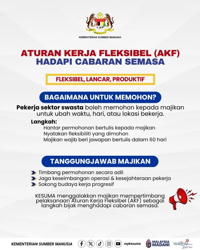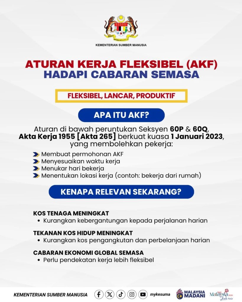 Pelaksanaan Aturan Kerja Fleksibel (AKF) kini menjadi antara pendekatan utama yang digalakkan oleh kerajaan Malaysia dalam menghadapi cabaran ekonomi semasa, termasuk krisis tenaga global dan peningkatan kos sara hidup. Inisiatif ini diperkenalkan bagi membantu pekerja menyesuaikan cara kerja agar lebih fleksibel dan produktif.