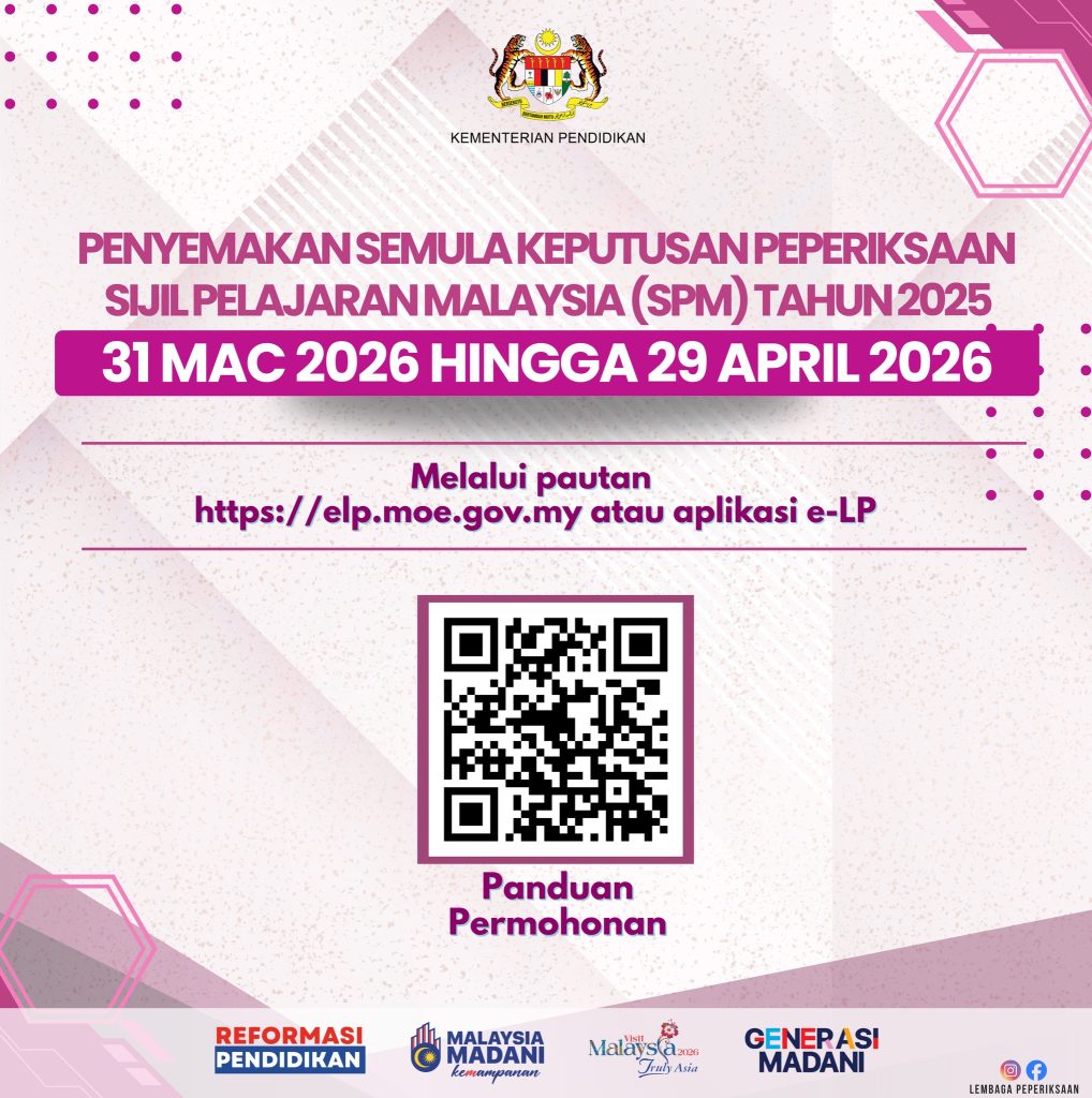 Permohonan penyemakan semula keputusan Sijil Pelajaran Malaysia (SPM) Tahun 2025 kini telah dibuka secara rasmi oleh Kementerian Pendidikan Malaysia (KPM) melalui Lembaga Peperiksaan. Peluang ini diberikan kepada calon yang ingin menyemak semula keputusan peperiksaan sekiranya terdapat keraguan terhadap markah yang diperoleh.