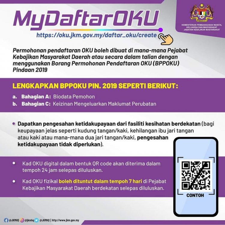 Untuk makluman anda, permohonan pendaftaran OKU boleh dibuat di mana-mana Pejabat Kebajikan Masyarakat Daerah ATAU secara dalam talian dengan menggunakan Borang Permohonan Pendaftaran OKU (BPPOKU) Pindaan 2019.
