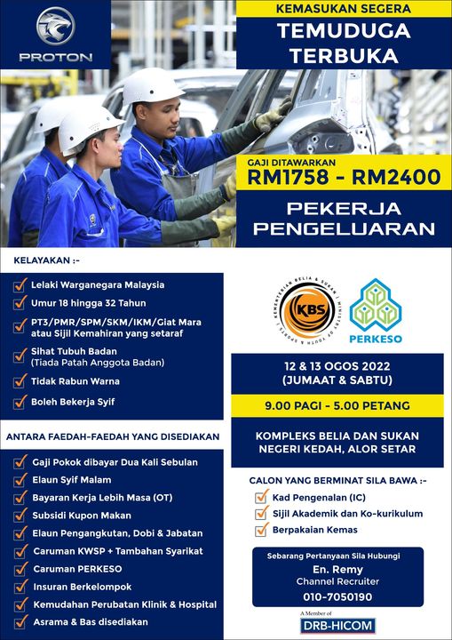 Perusahaan Otomobil Nasional Sdn Bhd (PROTON) sedang mencari calon lelaki warganegara Malaysia yang merupakan lepasan sekolah untuk hadir temuduga terbuka bagi memohon jawatan Pekerja Pengeluaran.