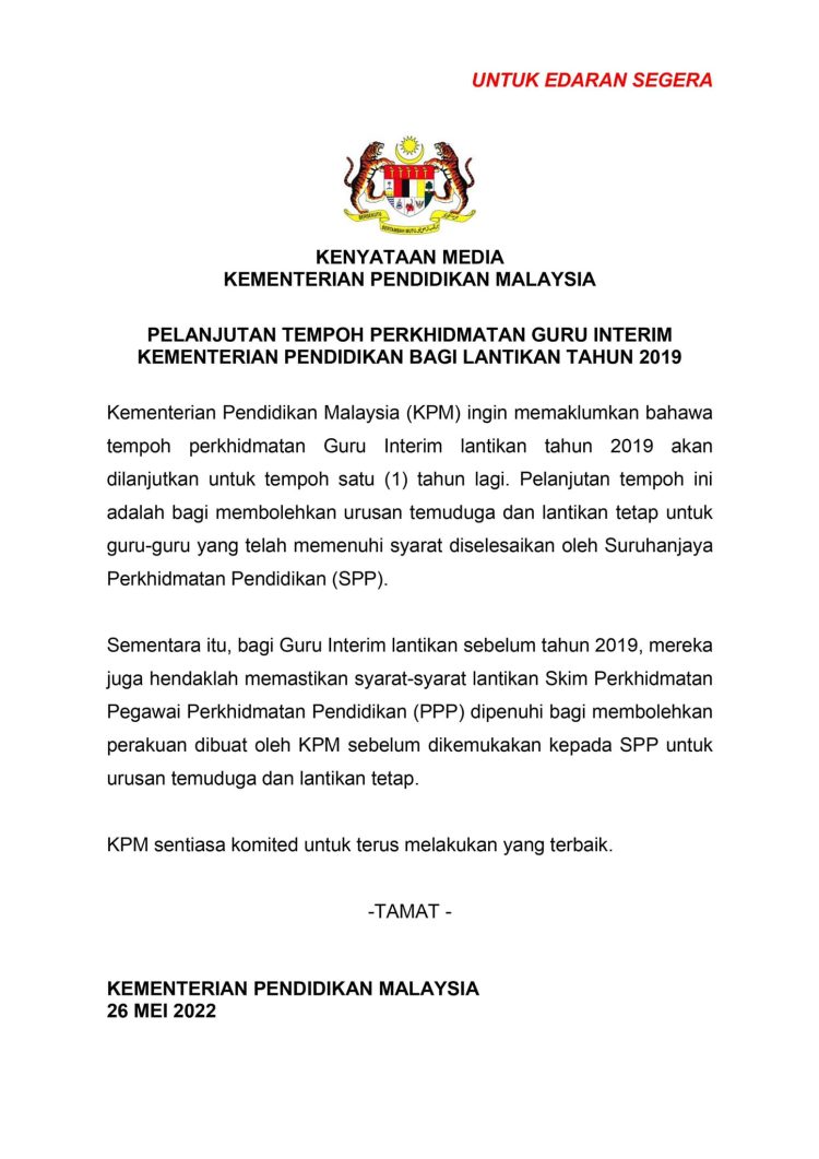 Ikuti perkongsian di bawah untuk maklumat lanjut pelanjutan tempoh perkhidmatan guru interim KPM bagi lantikan tahun 2019.