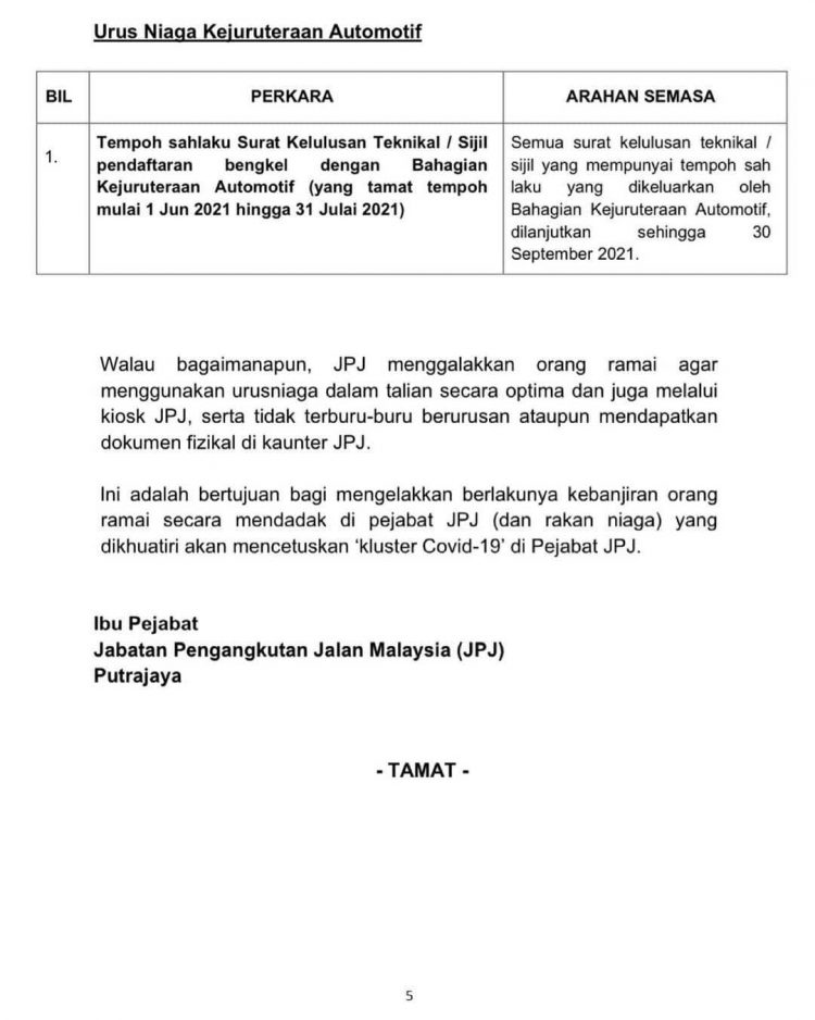 Sehubungan itu, bagi memastikan penyampaian perkhidmatan kepada rakyat tidak terjejas, maka Ketua Pengarah Pengangkutan Jalan telah memutuskan Pelanjutan Khas diberikan kepada beberapa urusniaga yang tidak dapat dilaksanakan pada mana-mana tarikh antara tempoh masa 1 Jun 2021 hingga 31 Julai 2021.