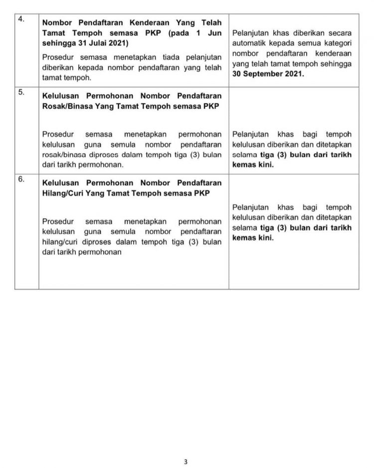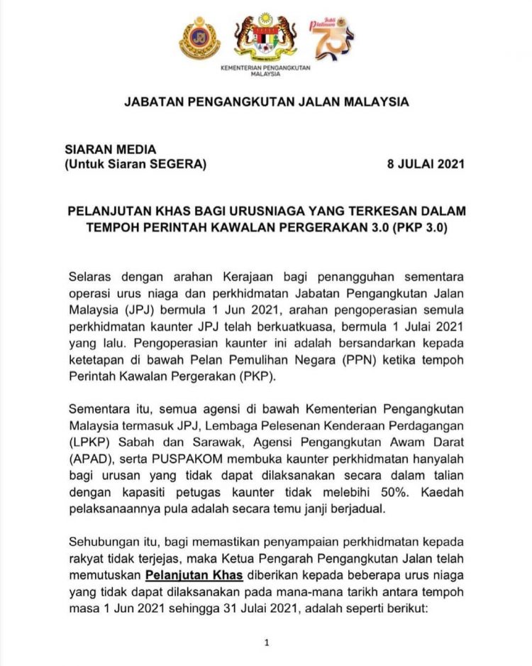 Sehubungan itu, bagi memastikan penyampaian perkhidmatan kepada rakyat tidak terjejas, maka Ketua Pengarah Pengangkutan Jalan telah memutuskan Pelanjutan Khas diberikan kepada beberapa urusniaga yang tidak dapat dilaksanakan pada mana-mana tarikh antara tempoh masa 1 Jun 2021 hingga 31 Julai 2021.