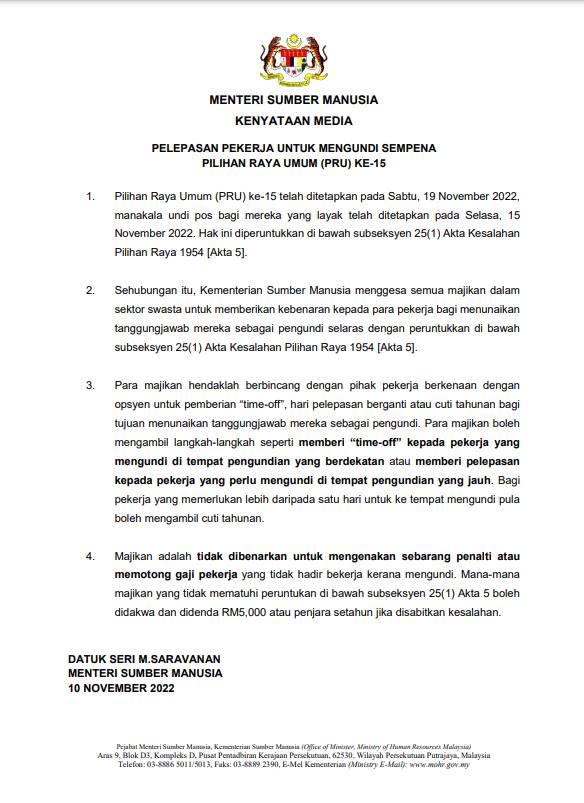 Sehubungan itu, Kementerian Sumber Manusia menggesa semua majikan dalam sektor swasta untuk memberikan kebenaran kepada para pekerja bagi menunaikan tanggungjawab mereka sebagai pengundi selaras dengan peruntukan di bawah subseksyen 25 (1) Akta Kesalahan Pilihan Raya 1954 [Akta 5].