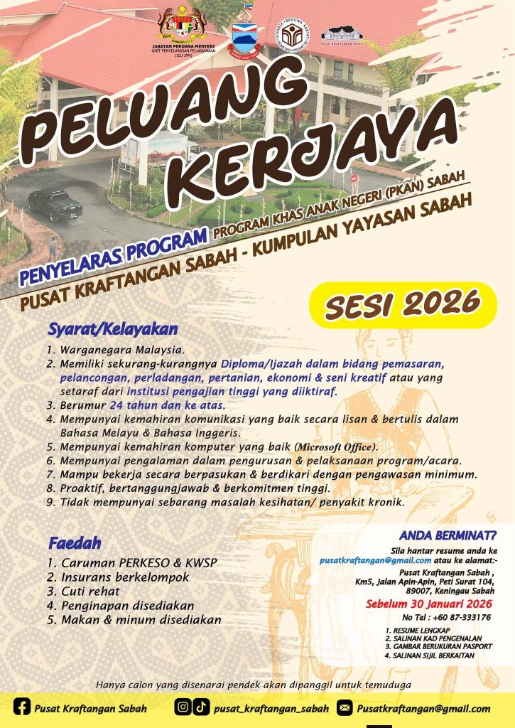 Pusat Kraftangan Sabah di bawah Kumpulan Yayasan Sabah membuka peluang kerjaya melalui Program Khas Anak Negeri (PKAN) Sabah bagi sesi 2026. Program ini menawarkan dua peranan berbeza iaitu dalam bidang pengurusan program dan kemahiran kraf.