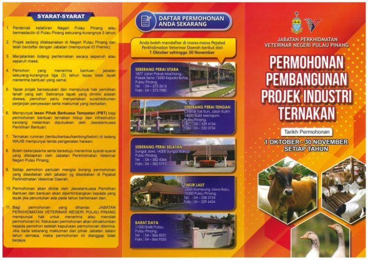Jabatan Perkhidmatan Veterinar Negeri Pulau Pinang mempelawa penternak yang berminat memohon bantuan Pembangunan Projek Industri Ternakan yang ditawarkan bagi mendapatkan pelbagai jenis bantuan yang disediakan oleh JPVPP.