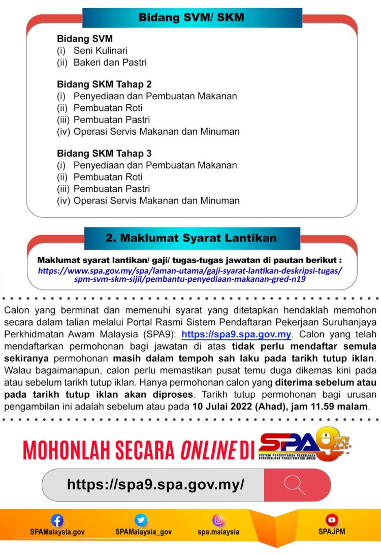- Jawatan: Pembantu Penyediaan Makanan Gred N19