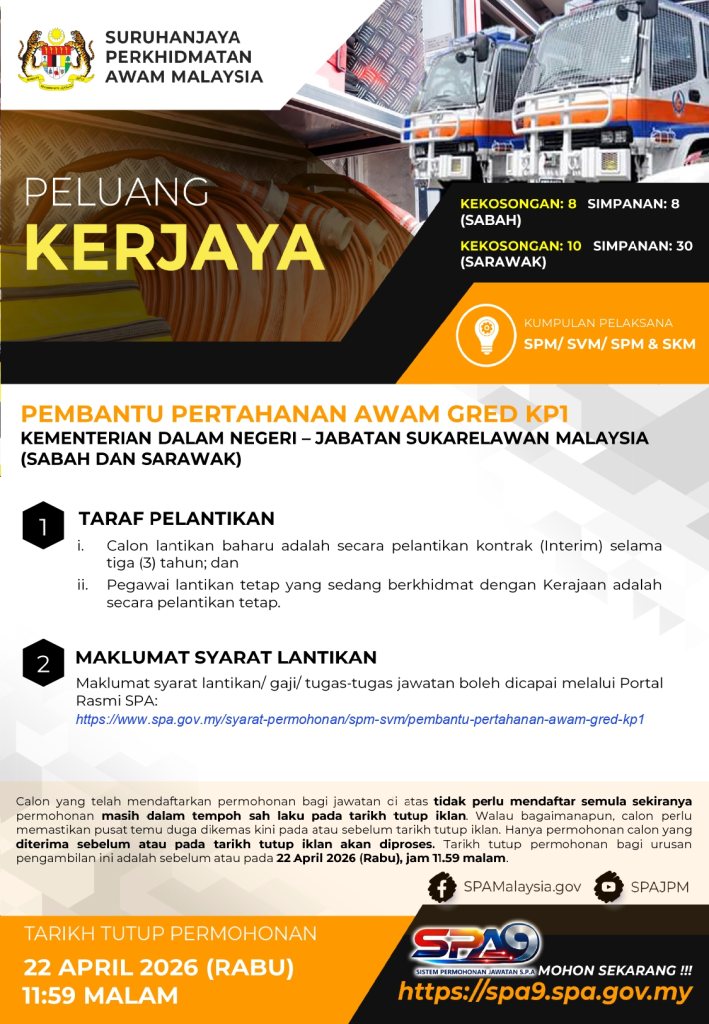 Jawatan Pembantu Pertahanan Awam Gred KP1 merupakan peluang terbaik untuk lepasan SPM yang ingin memulakan kerjaya dalam sektor keselamatan dan perkhidmatan awam. Dengan skop tugas yang mencabar serta peluang menimba pengalaman dalam operasi lapangan, jawatan ini sesuai untuk individu yang berdisiplin, berani dan komited.