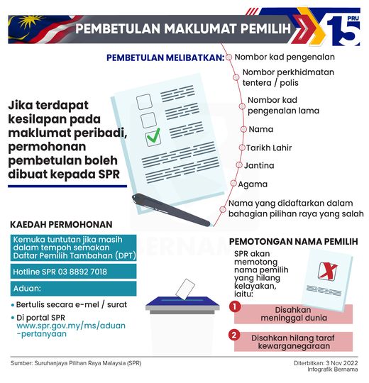 Untuk makluman anda, jika terdapat kesialapan pada maklumat peribadi, permohonan pembetulan boleh dibuat kepada Suruhanjaya Pilihan Raya (SPR).
