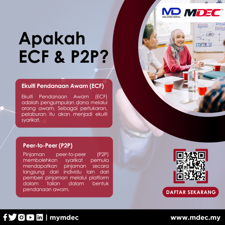 Perlukan pembiayaan untuk syarikat pemula anda? MDEC telah bekerjasama dengan 15 platform Ekuiti Pendanaan Awam (ECF) dan Peer-to-Peer (P2P) untuk membantu usahawan mengatasi cabaran ekonomi dan membantu memantapkan aliran tunai untuk perusahaan mikro, kecil dan sederhana (PMKS).
