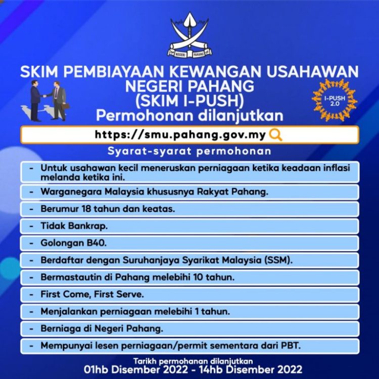 Kerajaan Negeri Pahang telah memaklumkan telah membuka permohonan Skim Pembiayaan Kewangan Usahawan Mikro Negeri Pahang (Skim i-PUSH) bagi Fasa 2.