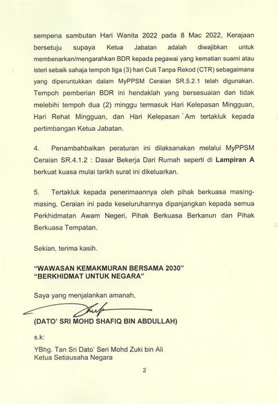 Mulai 10 Mac 2022, semua ketua jabatan diwajibkan membenarkan pegawainya yang baru kematian suami atau isteri untuk Bekerja Dari Rumah (BDR) sebaik sahaja tempoh tiga hari Cuti Tanpa Rekod (CTR) tamat.