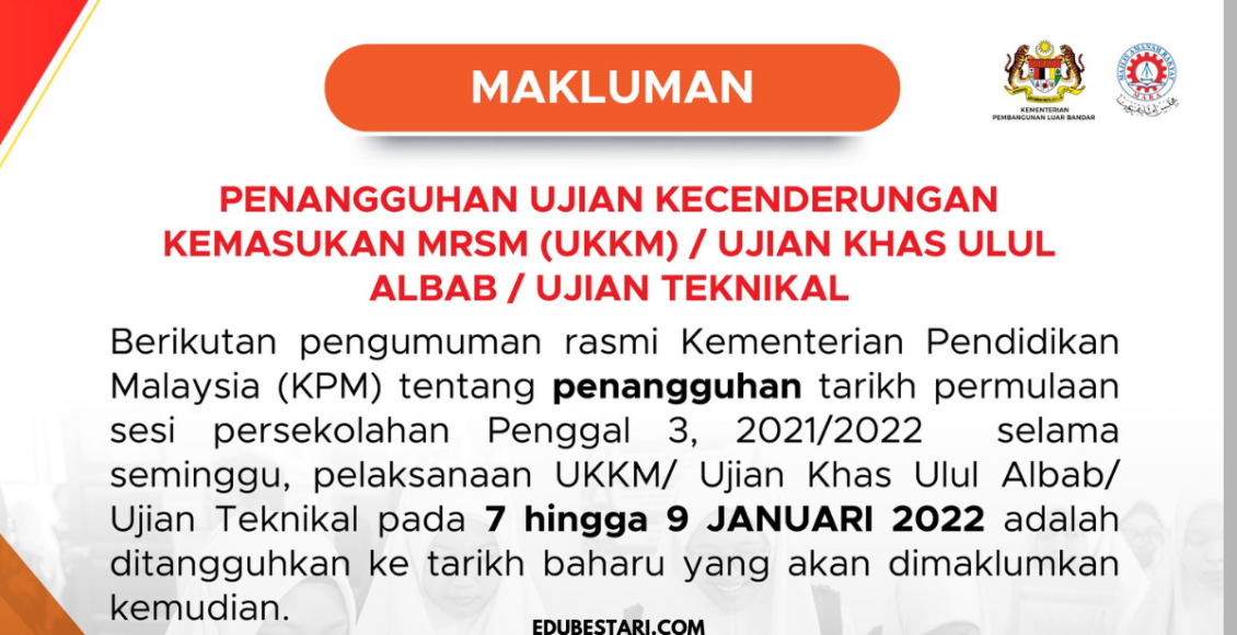Ikuti perkongsian di bawah untuk maklumat lanjut penangguhan Ujian Kecenderungan Kemasukan MRSM (UKKM)/ Ujian Khas Ulul Albab/ Ujian Teknikal.