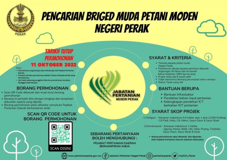 Petani muda yang berminat nak kembangkan projek pertanian menerusi bantuan dan peruntukan disediakan boleh buat permohonan pencarian Briged Muda Petani Moden Negeri Perak yang kini telah dibuka! Pelbagai bentuk bantuan disediakan kepada petani muda yang berkelayakan untuk kembangkan projek pertanian.