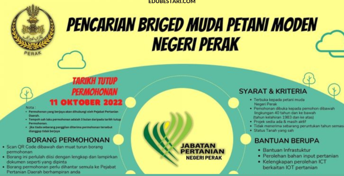 Petani muda yang berminat nak kembangkan projek pertanian menerusi bantuan dan peruntukan disediakan boleh buat permohonan pencarian Briged Muda Petani Moden Negeri Perak yang kini telah dibuka! Pelbagai bentuk bantuan disediakan kepada petani muda yang berkelayakan untuk kembangkan projek pertanian.