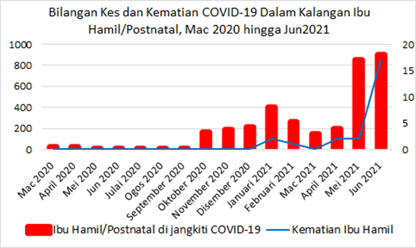 Berikut adalah bilangan kes dan kematian COVID-19 dalam kalangan ibu hamil/postnatal daripada Mac 2020 sehingga Jun 2021: