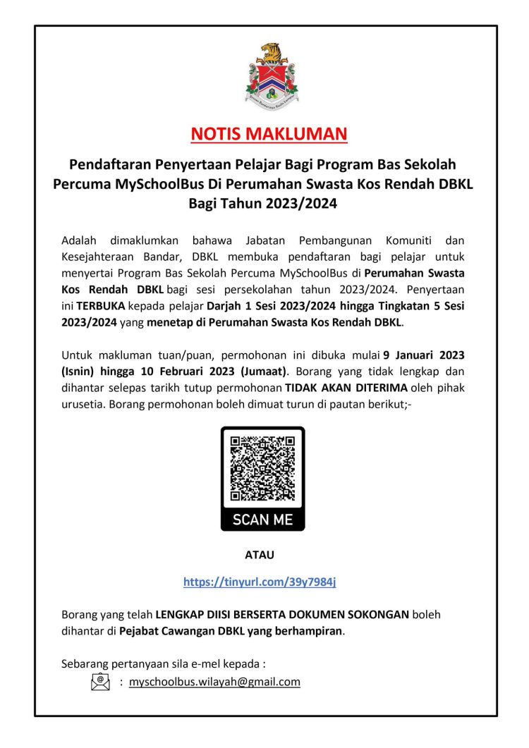 Adalah dimaklumkan bahawa Jabatan pembangunan Komuniti dan Kesejahteraan Bandar, DBKL membuka pendaftaran bagi pelajar untuk menyertai Program Bas Sekolah Percuma MySchoolBus di Perumahan Awam (PA)/ Projek Perumahan Rakyat (PPR)/ Perumahan Swasta Kos Rendah DBKL bagi persekolahan tahun 2023/2024.