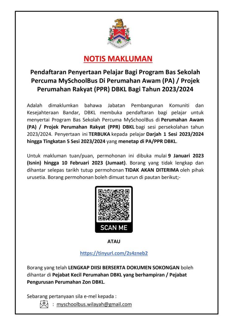 Adalah dimaklumkan bahawa Jabatan pembangunan Komuniti dan Kesejahteraan Bandar, DBKL membuka pendaftaran bagi pelajar untuk menyertai Program Bas Sekolah Percuma MySchoolBus di Perumahan Awam (PA)/ Projek Perumahan Rakyat (PPR)/ Perumahan Swasta Kos Rendah DBKL bagi persekolahan tahun 2023/2024.