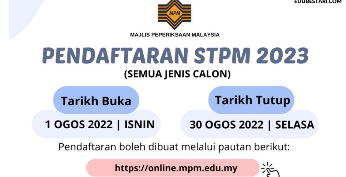 Pendaftaran STPM 2023 bagi SEMUA JENIS CALON boleh dibuat secara atas talian melalui laman Majlis Peperiksaan Malaysia (MPM).