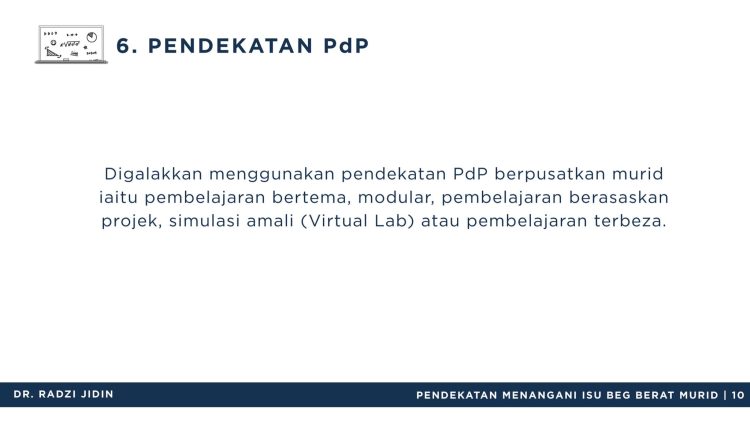 Sebanyak 7 pendekatan dan ketetapan digariskan yang akan dilaksanakan oleh KPM bagi meringankan beban beg berat murid ke sekolah selepas ini dengan harapan memberi kesenangan kepada murid sekolah di seluruh Malaysia khususnya murid Tahap 1 di sekolah rendah.