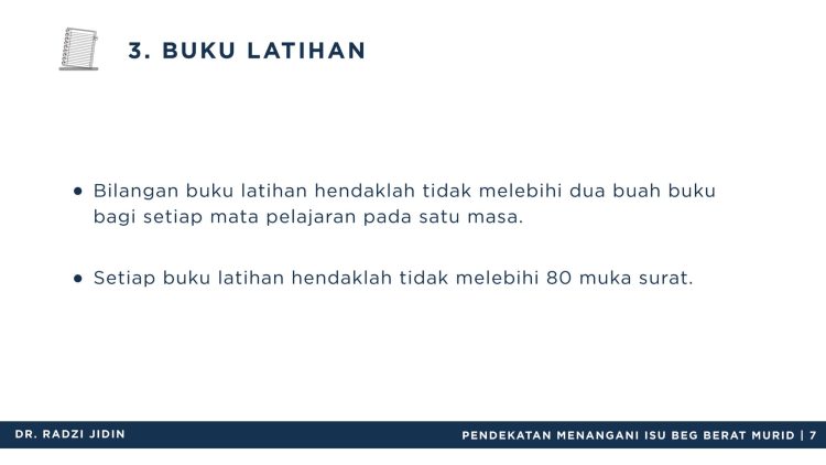 Bilangan buku latihan hendaklah tidak melebihi dua buah buku bagi setiap mata pelajaran pada satu satu masa. Setiap buku latihan hendaklah tidak melebihi 80 muka surat.