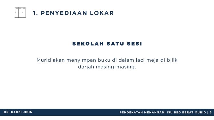 KPM akan menyediakan lokar di sekolah rendah secara berfasa. Fasa 1 akan melibatkan penyediaan lokar untuk murid Tahap 1 iaitu Tahun 1, Tahun 2 & Tahun 3 di sekolah rendah yang beroperasi secara dua sesi.
