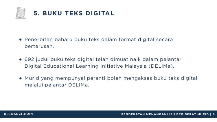 Penerbitan baharu buku teks digital dalam format digital secara berterusan. Sehingga kini, sebanyak 692 judul buku teks digital telah dimuat naik dalam pelantar Digital Educational Learning Initiative Malaysia (DELIMa). Murid yang mempunyai peranti boleh mengakses buku teks digital melalui pelantar DELIMa.