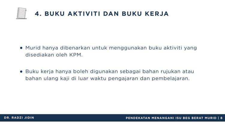 Oleh yang demikian, bagi menangani isu beg berat murid, antara ketetapan KPM yang akan dilaksanakan segera adalah seperti berikut: