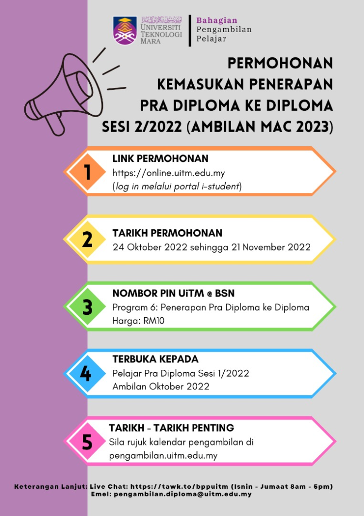 Untuk maklumat lanjut atau sebarang pertanyaan berkenaan permohonan peneraima program Pra Diploma ke Diploma UiTM, anda boleh terus emel ke alamat pengambilan.diploma@uitm.edu.my.
