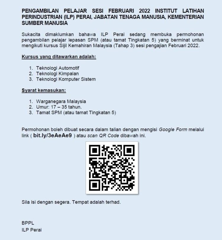 Pengambilan Pelajar Baru Institusi Latihan Perindustrian (ILP) Sesi Februari 2022 Kini Dibuka