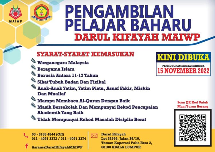 Ikuti perkongsian di bawah untuk maklumat lanjut syarat kemasukan ke Asrama Darul Kifayah dan panduan buat permohonan.