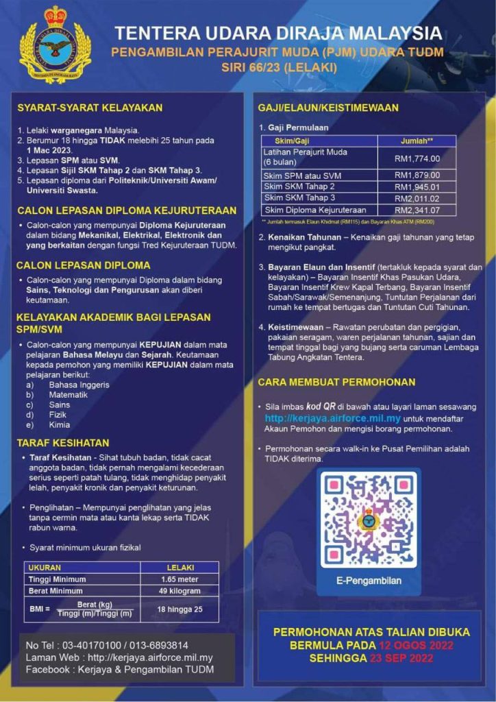 Peluang kerjaya dalam Tentera Udara Diraja Malaysia (TUDM), Pengambilan Perajurit Muda (PjM) Udara Siri 66/23 kini dibuka kepada seluruh rakyat Malaysia yang berkelayakan dan menepati syarat yang telah ditetapkan serta berminat untuk menceburi profesion ketenteraan.