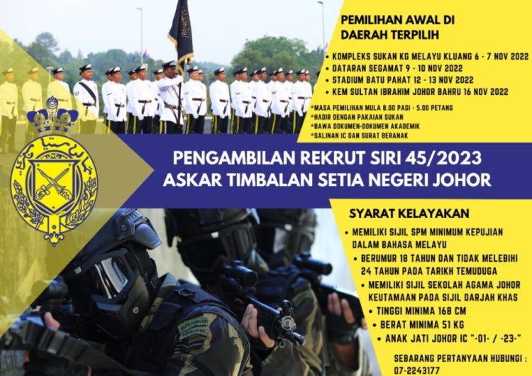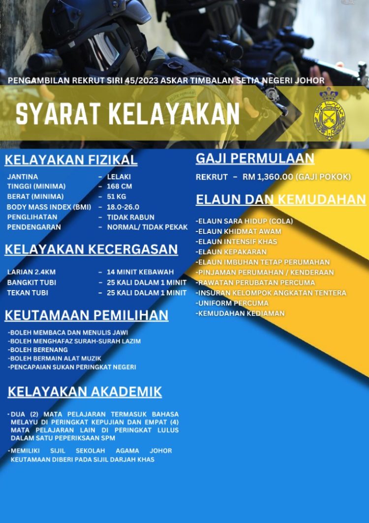 Pengambilan Terbuka Rekrut Siri 45/2023 Askar Timbalan Setia Negeri Johor, Mohon Dengan Minima SPM