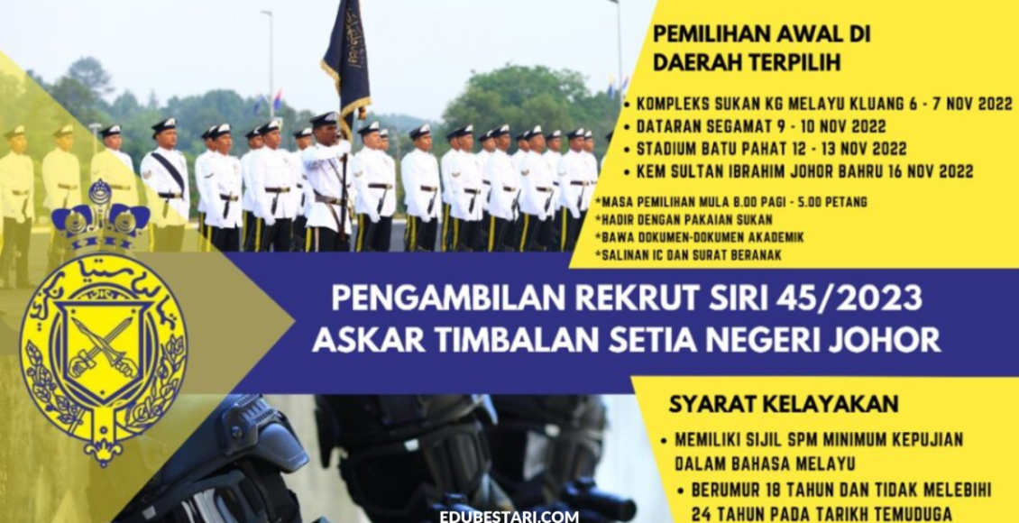 Panggilan buat anak jati Johor! Kerajaan Negeri Johor Darul Ta’zim kini sedang membuka pengambilan Rekrut Siri 45/2023 Askar Timbalan Setia Negeri Johor melalui pemilihan awal di daerah terpilih seperti disenaraikan pada tarikh -tarikh yang ditetapkan. Permohonan boleh dibuat dengan menggunakan minima sijil SPM!