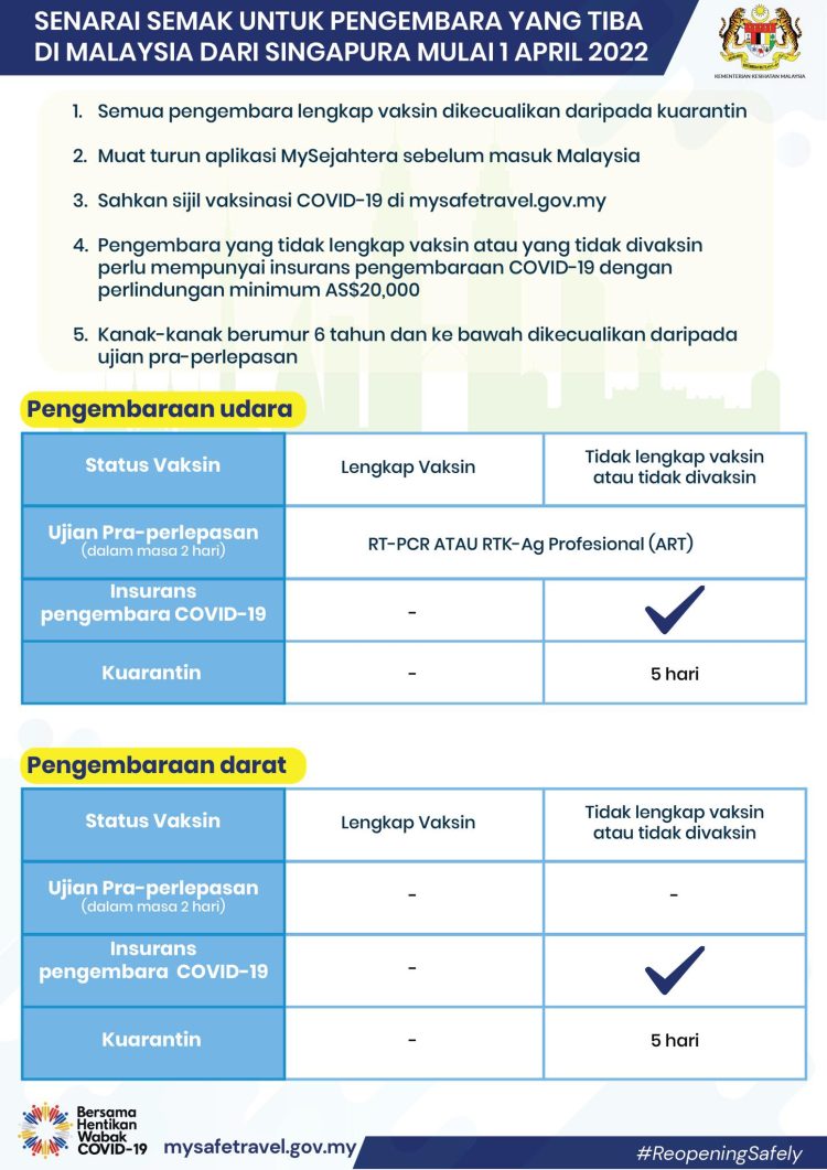 Berikut adalah senarai semak untuk pengembara yang tiba di Malaysia dari Singapura mulai 1 April 2022: