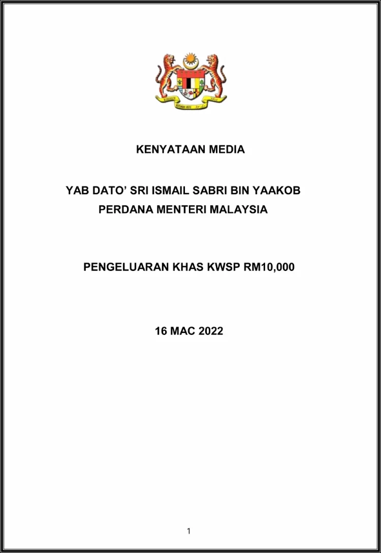 Pada 16 Mac 2022, kerajaan telah umumkan bersetuju membenarkan pengeluaran khas KWSP sebanyak: